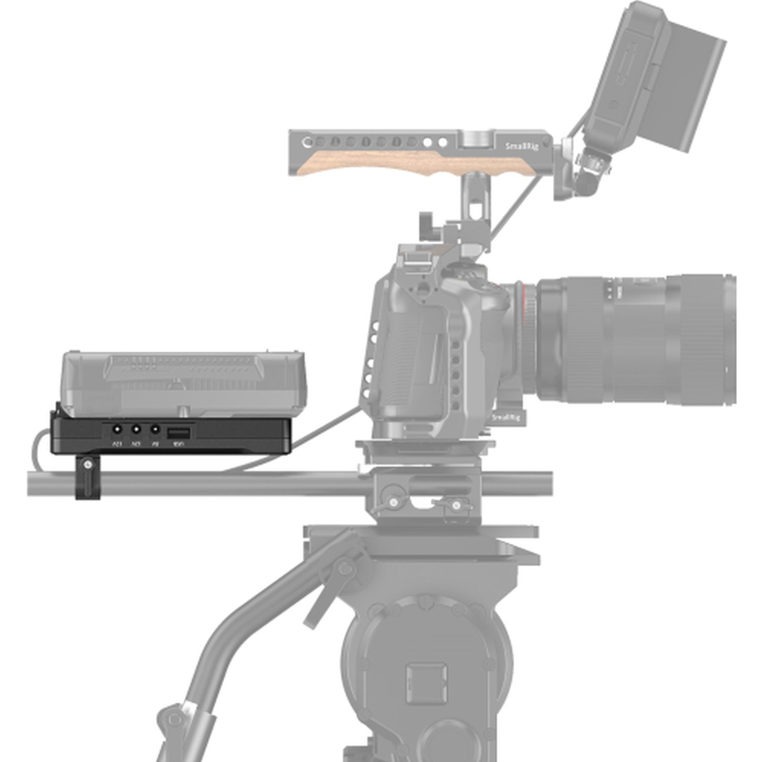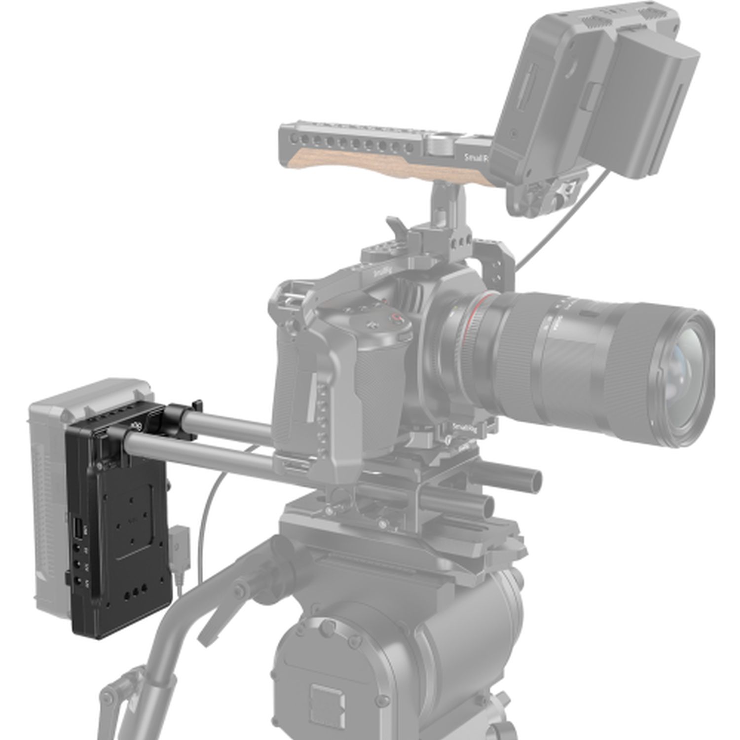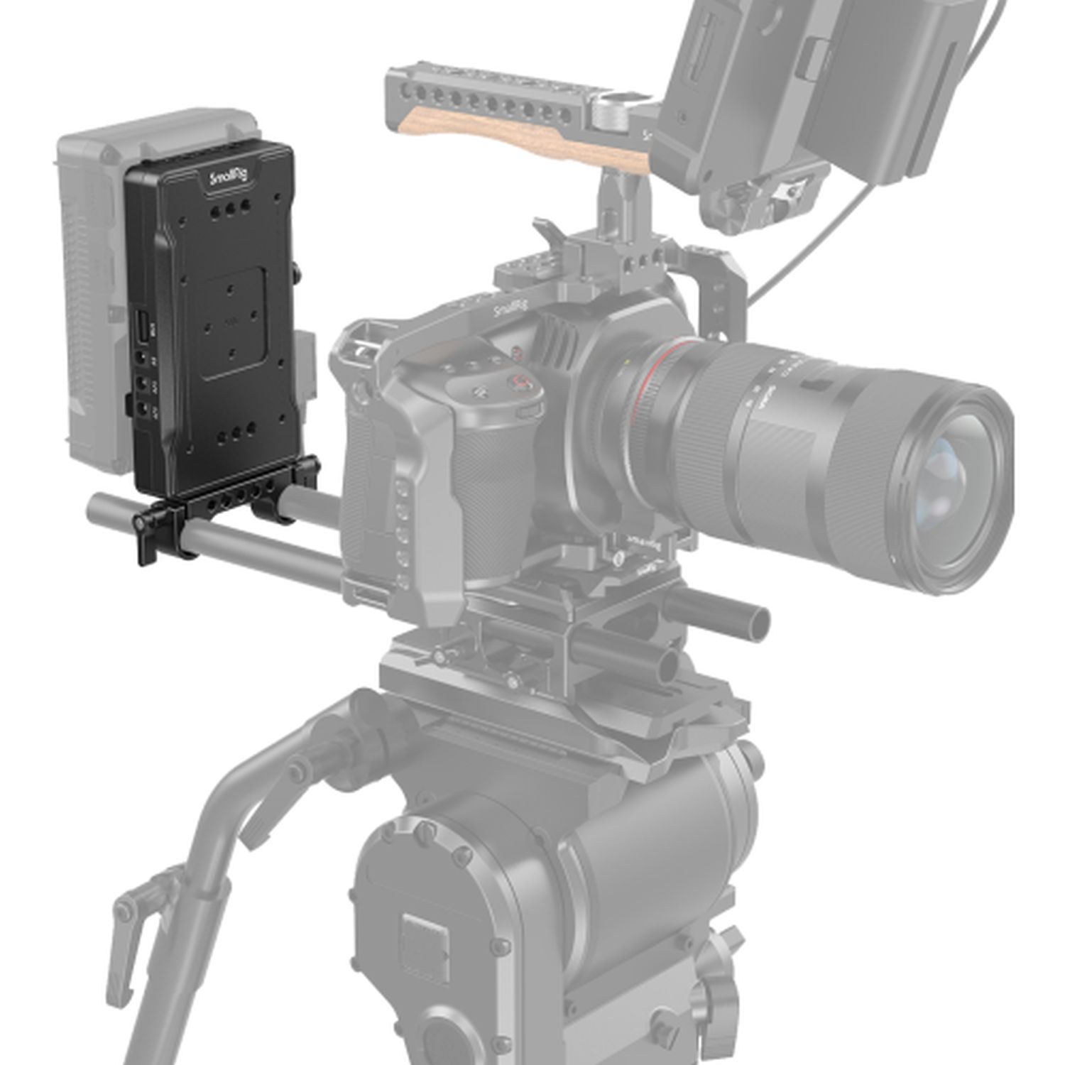 The SmallRig V-mount battery adapter plate with dual 15 mm rod clamp 3203 extends your camera rig and enables the use of a V-mount battery for a longer battery life. Product images show optional accessories and application examples.