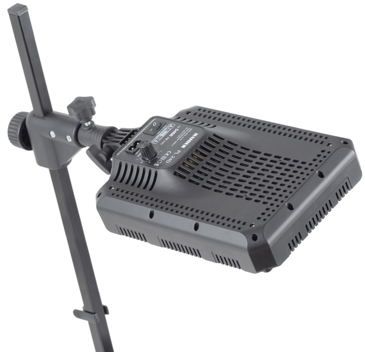 LED daylight lighting unit with two 24-watt PL 24D panel lights for soft, uniform illumination. Infinitely dimmable. 16 × 16 mm support rods with robust cast aluminum clamping bases for secure fastening. Product images show optional accessories and application examples.