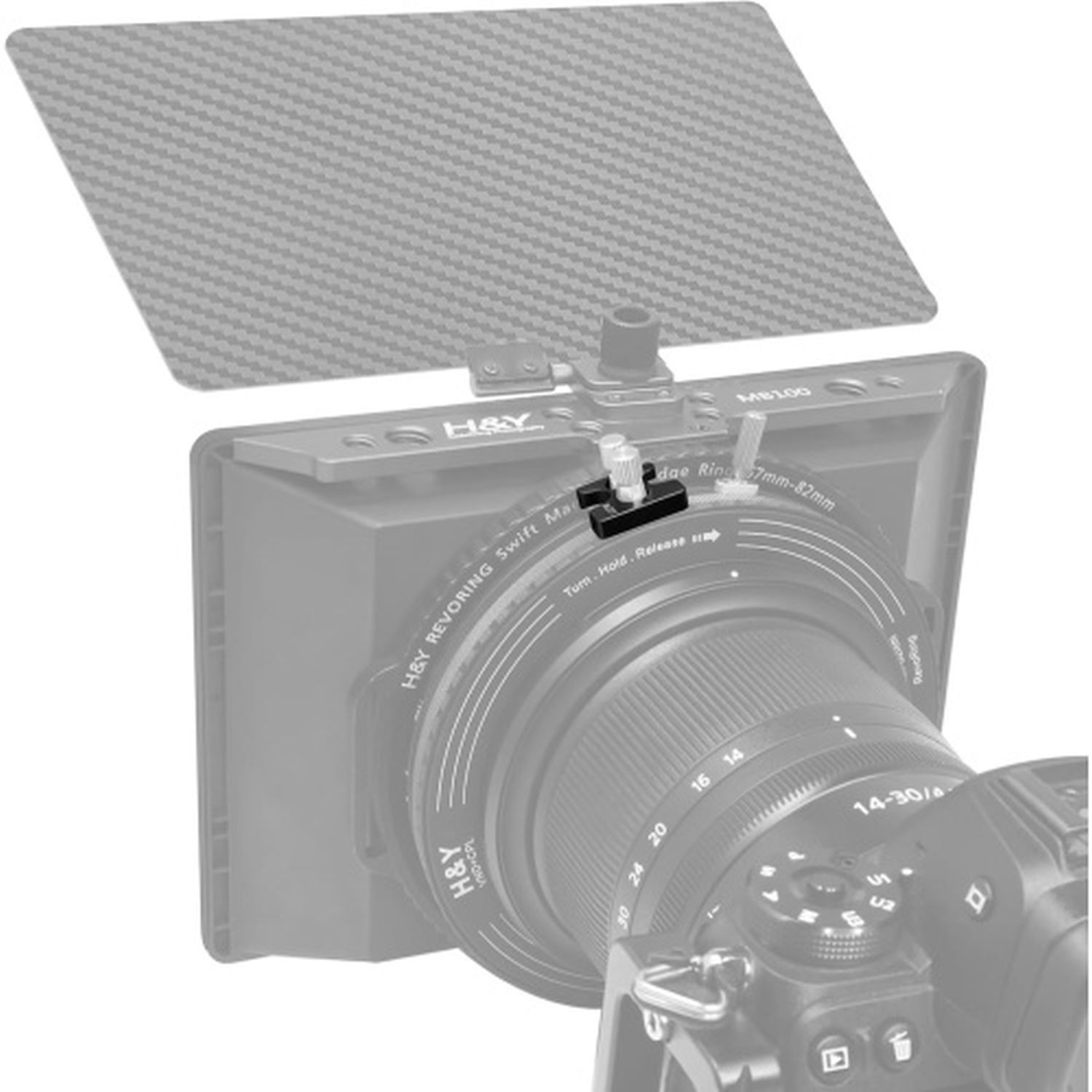 The H&Y REVORING RC01 fixing unit is a practical accessory for locking the rotary pins on the ND-1000+CPL filter. It ensures that the neutral density and polarizing filters do not move against each other unintentionally during video recordings. Product images show optional accessories and application examples.
