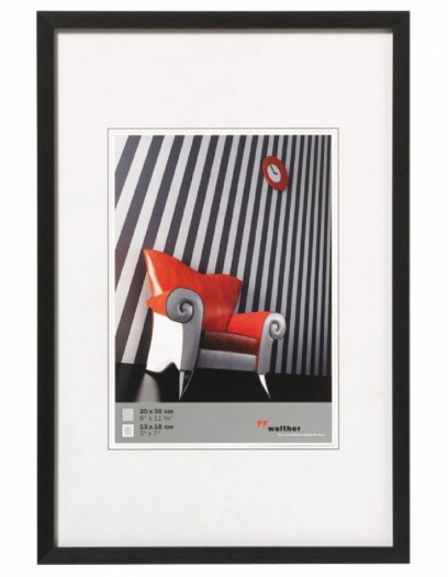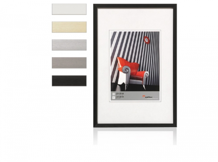 Aluminum frame Chair Narrow block profile with holistic anodized matt brushed surface in many standard formats, square formats and five colors. The square formats are equipped with a real bevel cut passepartout.